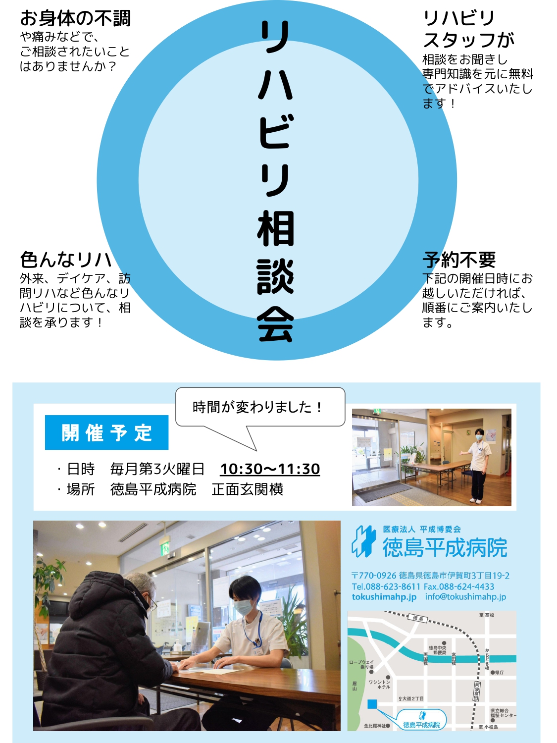 毎月第3火曜日の10時30分~11時30分の間、病院玄関横でリハビリ相談会を実施しています。