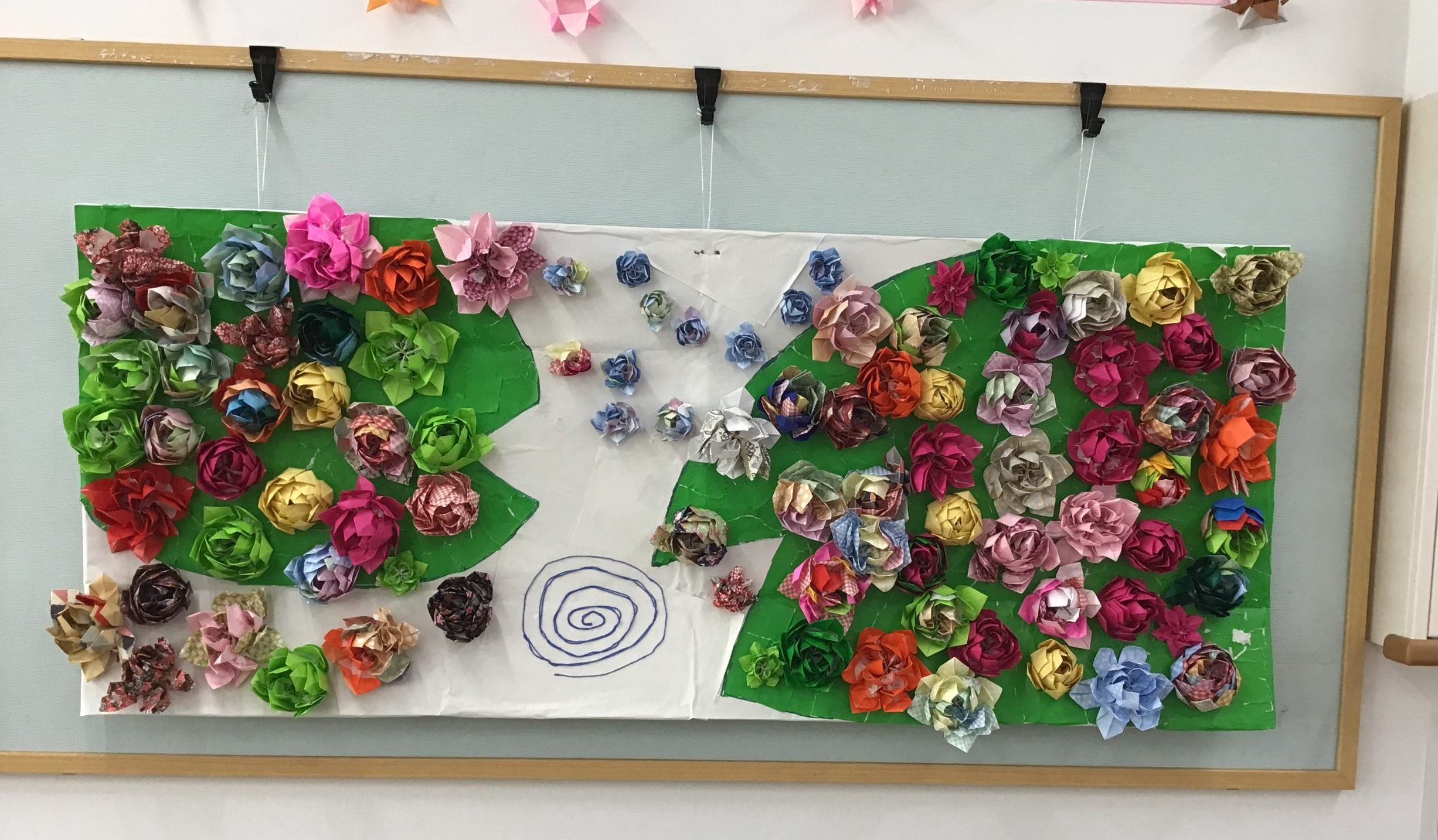 今回の壁画では、大きなハスの葉の上に、色とりどりのハスの花を飾りました。