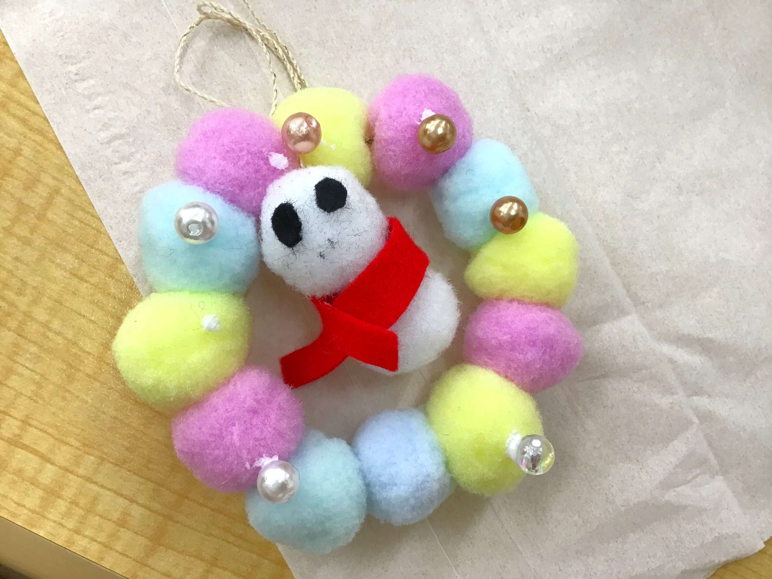 作り方は、カラフルなフェルトボールを糸に通して繋げていきます。