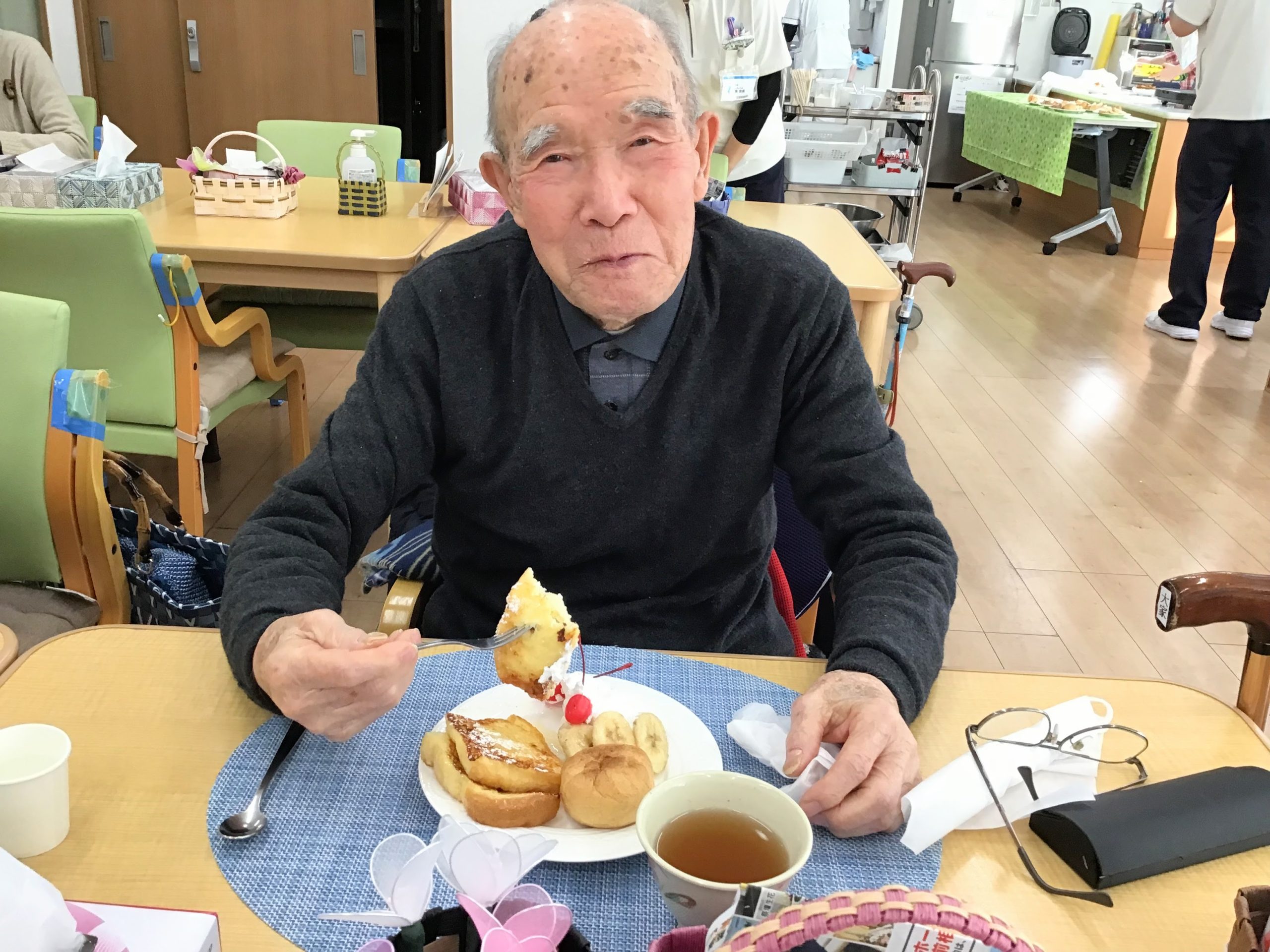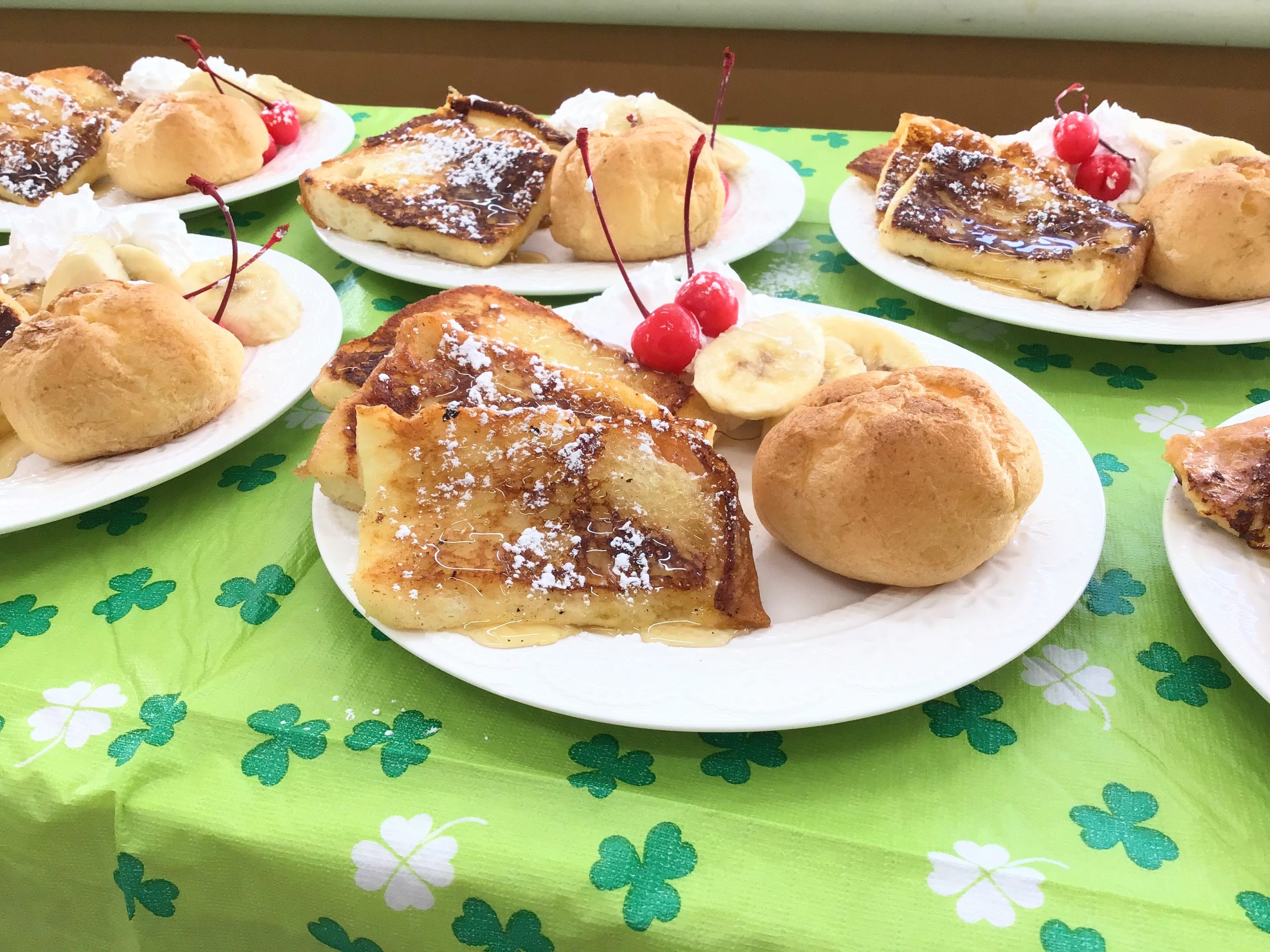 今月のメニューは、フレンチトースト、シュークリーム、バナナ、サクランボ添え🍒