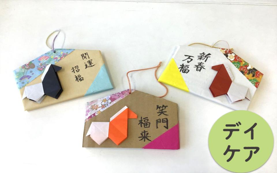 丈夫な段ボールを土台に、鮮やかな千代紙を貼って絵馬を作りました!