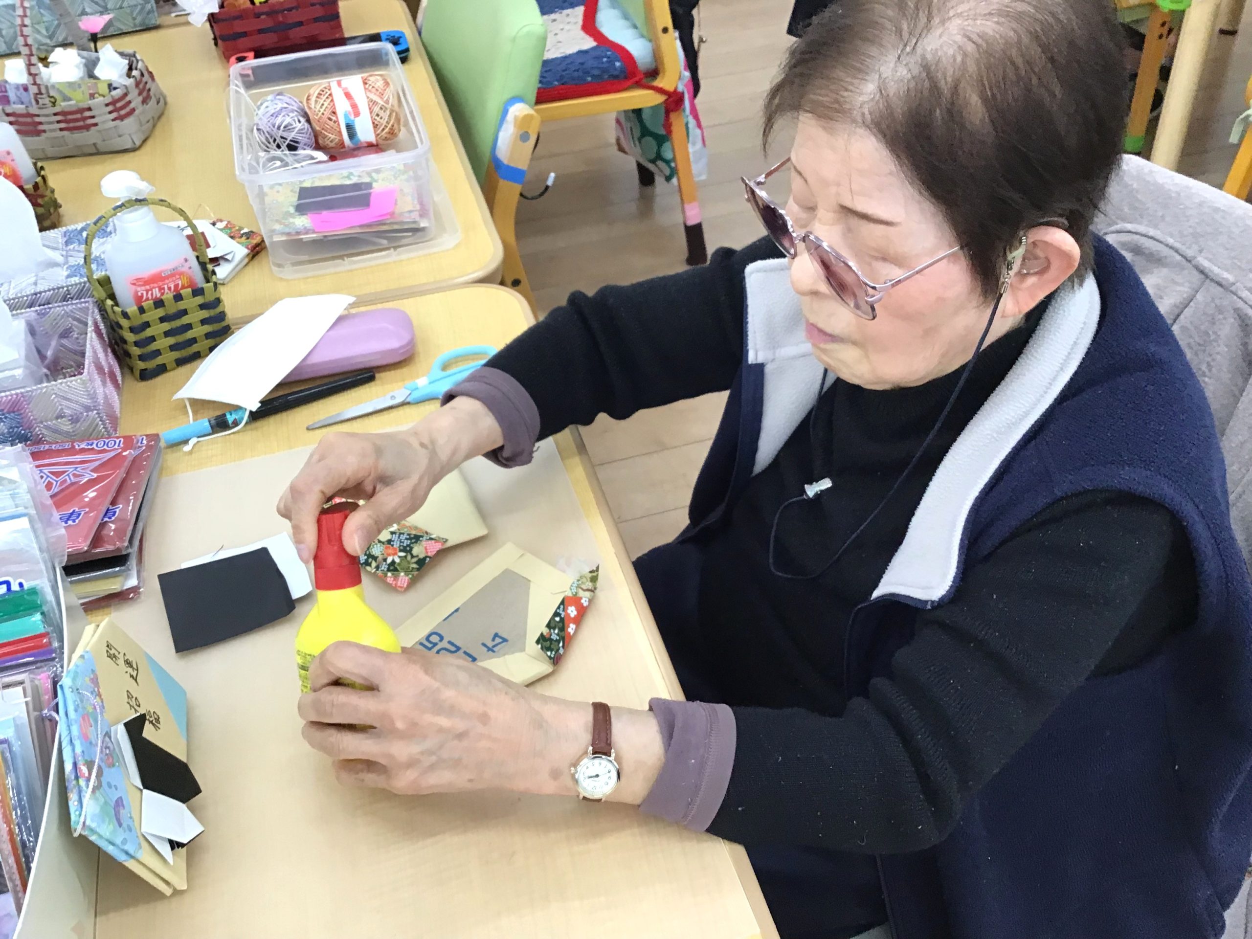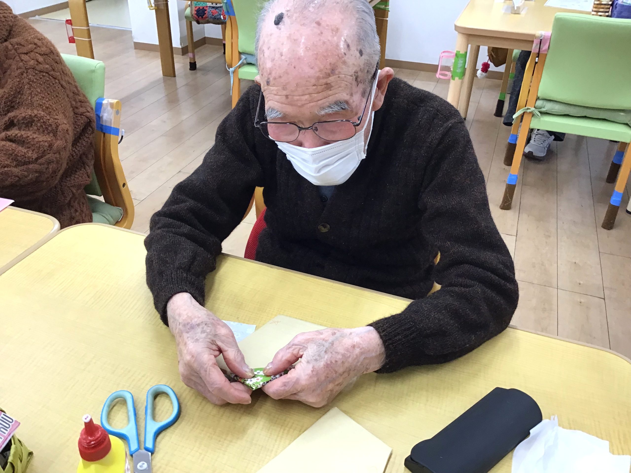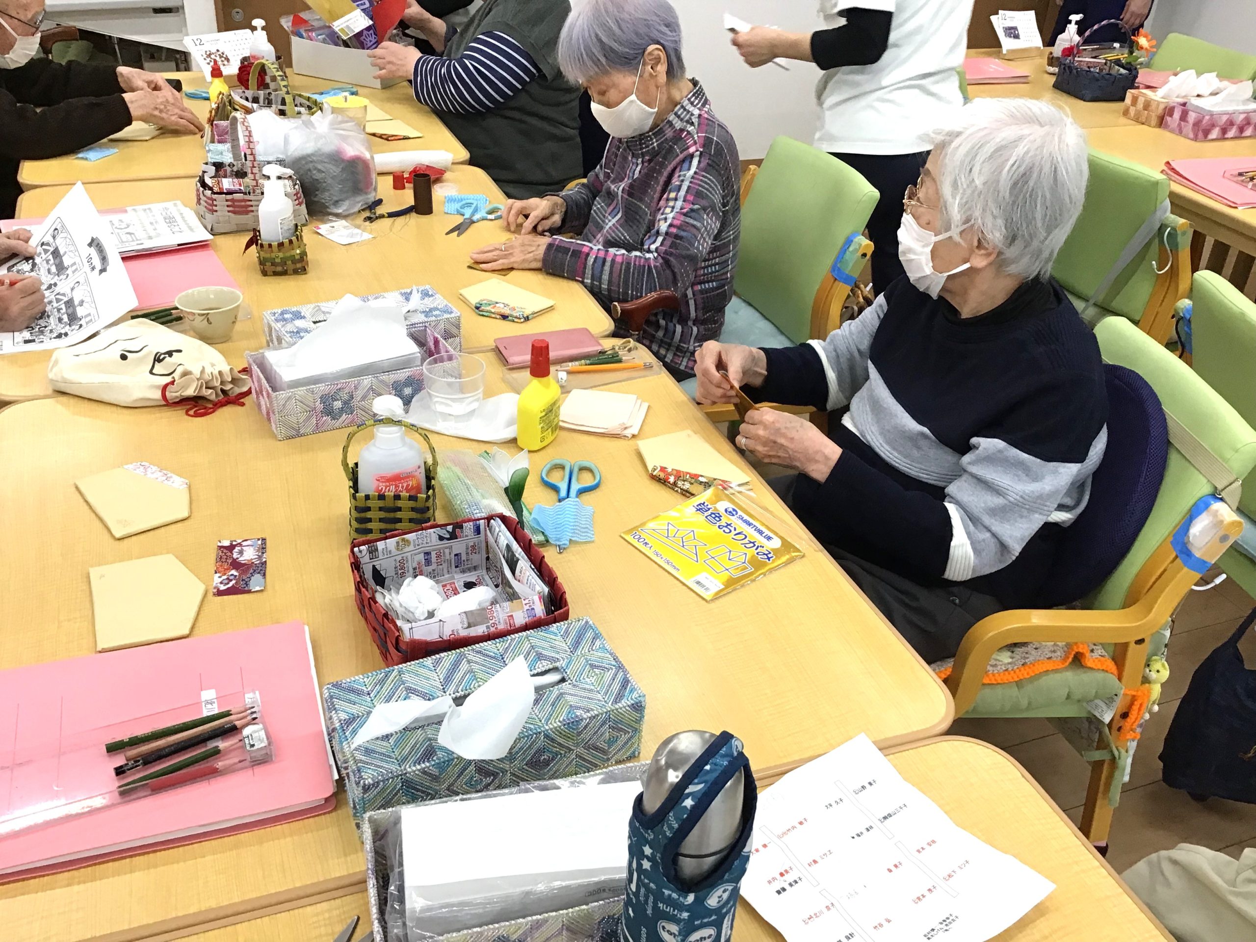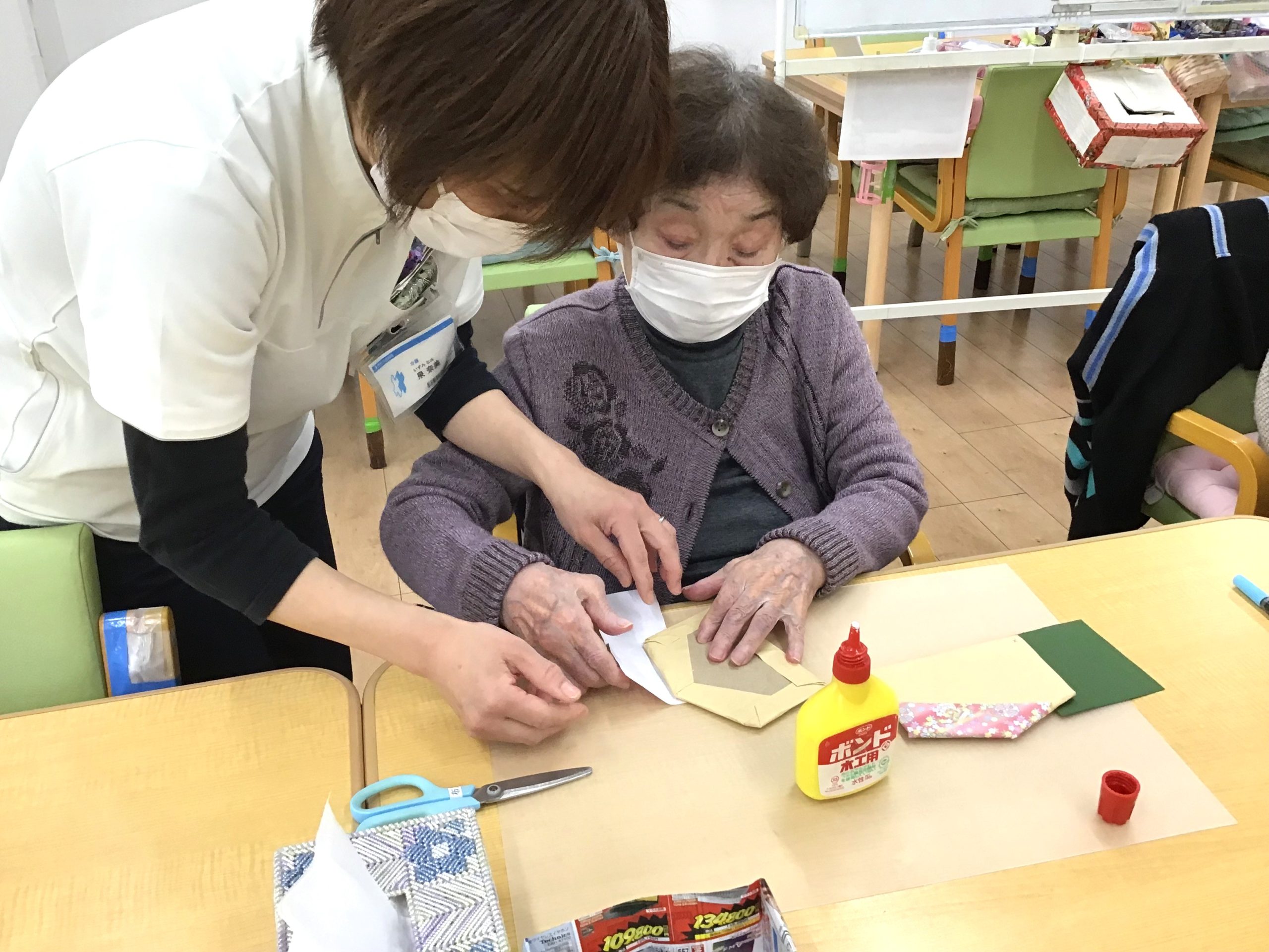 \千代紙の貼り方等、細かなところは職員が隣で一緒にお手伝い♪/
